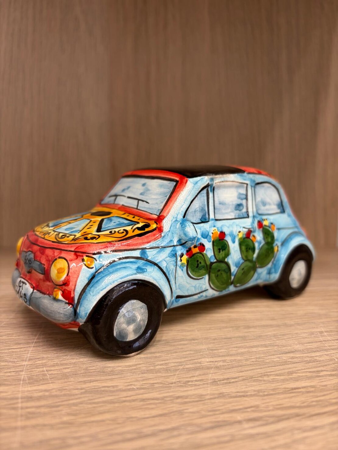 Modello Fiat 500' creato in ceramica e decorato artigianalmente a mano.